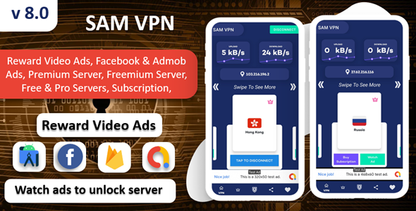 SamVPN is very fast and secure VPN app and it’s have lot of secure servers in this VPN app when you can Swipe the Servers You can See more & more servers. In this VPN app you can connect to any country server with only one click. We are using OneConnect Sdk. You can connect to any server with a simple Swipe Effect. Now you can easily unblock those ego-restricted websites and gain access. In this app we have built-in Reward Video Ads for users to Unlock Premium Servers. You will make Revenue by through these Subscriptions & Reward Video ads, Interstitial ads, and Banner ads. We have also Integrated Facebook and Admob Ads.