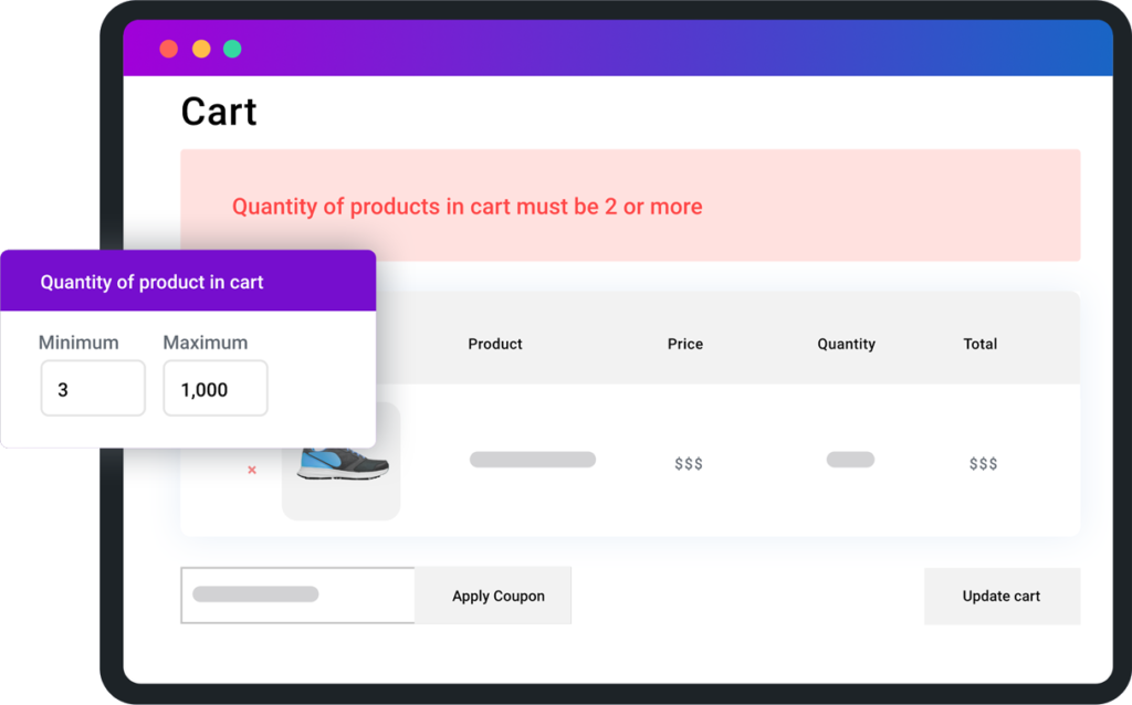 - Set a minimum and maximum quantity required to checkout